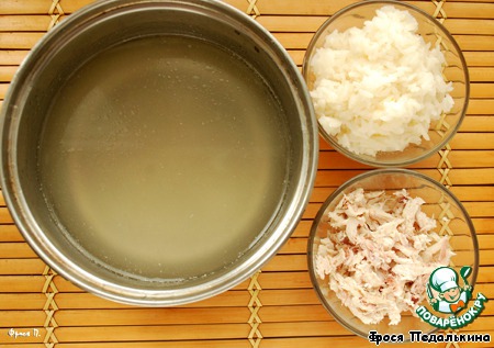 Бульон процедить, куриное мясо разобрать на волокна.