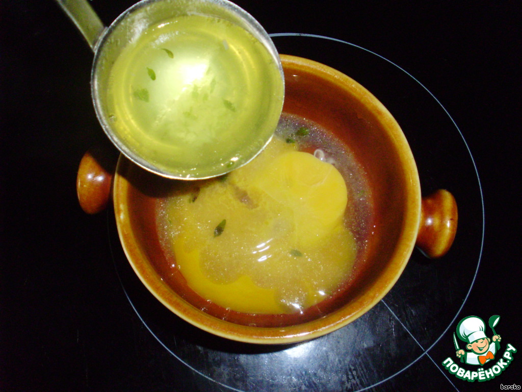 Подогреть суповую тарелку и вылить в неё желток.
