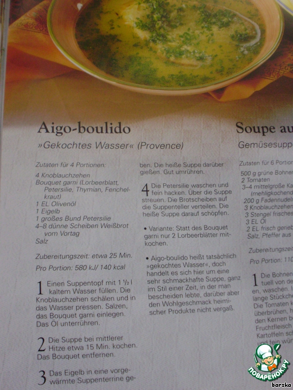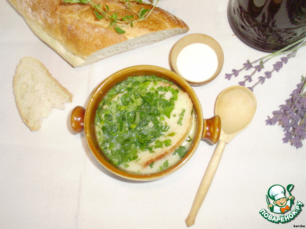 | Суп Aigo boulido. Однажды во Франции, в те далeкие времена, когда люди жили очень скромно, буквально, "на хлебе и воде", появился этот незамысловатый чесночный суп, спасавший от голода и помогавший выжить. Если Вы думаете, что этот суп устарел, то ошибаетесь. Он и сегодня очень популярен на кухне, особенно после бурных праздников. Да-да, суп от похмелья... |