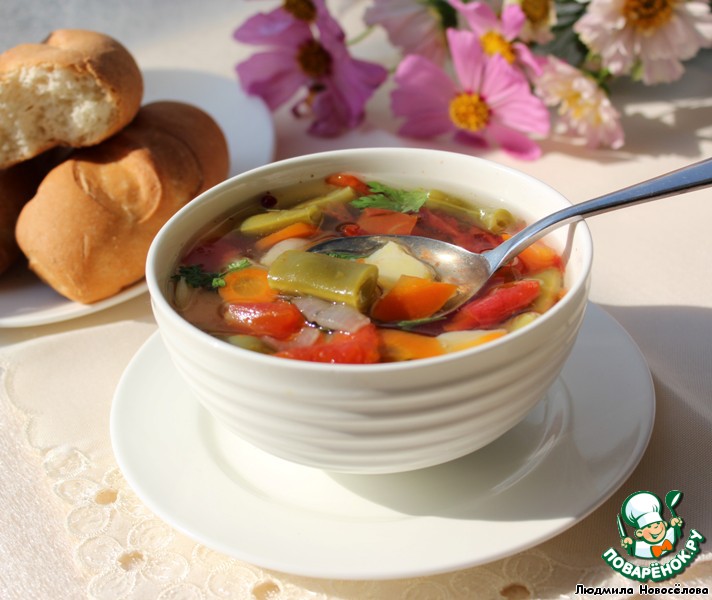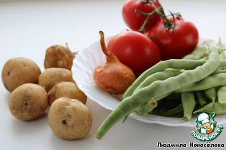 Главное условие - это свежие овощи, молодой картофель, помидоры, лук и самый важный компонент - это спаржевая фасоль, которая играет "главную скрипку" в этом супе.