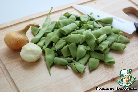 Дальше всё, что нам надо сделать - это поставить на огонь кастрюльку с водой и заняться овощами. У фасоли удалить "жилку" и нарезать, именно она придаст супу мясной вкус. Очистить луковицу, нарезать.