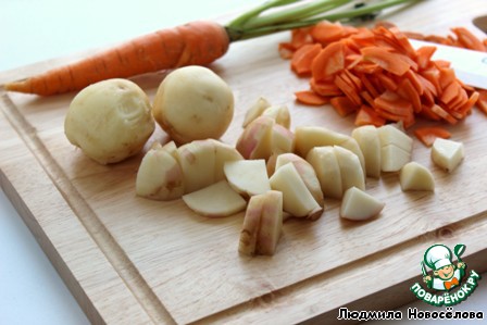 Молодой картофель очистить, нарезать кубиками. Можно нарезать покрупнее, я, учитывая пожелания семьи, режу помельче. Тоненько режем морковь.