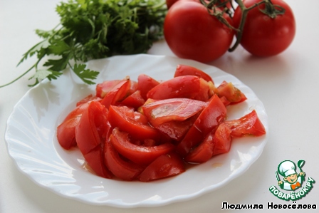 То же самое делаем с помидорами, тонко нарезаем. Если есть желание, можете обварить их кипятком и снять кожицу (у меня такого желания не было).