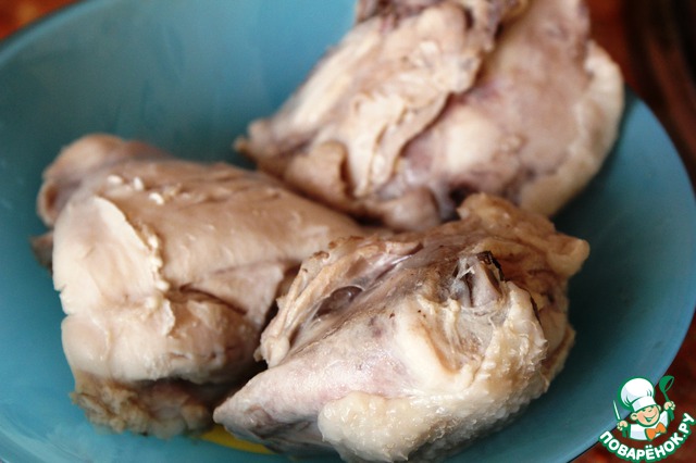 Курицу разрезать на части. Промыть. Залить водой, довести до кипения, варить до готовности.