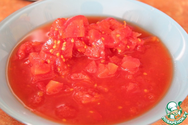 Томаты в собственном соку очистить от кожуры, измельчить.