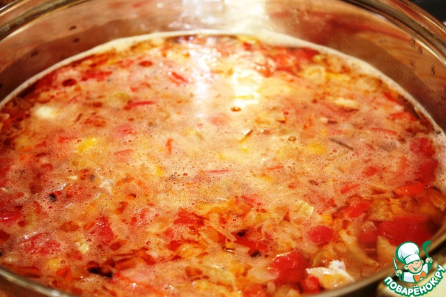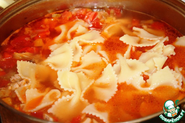 В куриный бульон (или воду, если хотите, чтобы суп был менее насыщенным) опустить обжаренные овощи, кусочки курицы, очищенные томаты вместе с соком, довести до кипения, уменьшить огонь.