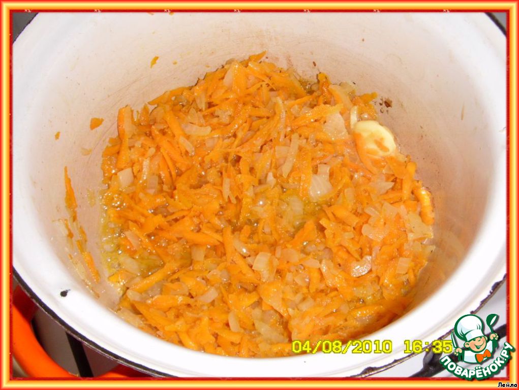 Чтобы не пачкать много посуды, тушу сразу в кастрюле, в которой будет супчик ;-), если не устраивает, то лук мелко нарезать, морковь натереть на терке. Отдельно в кастрюле пассеровать лук и морковь в сливочном масле или в маргарине до приятного аромата.