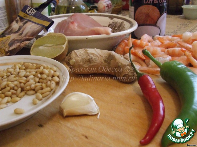В посуду блендера складываем орехи, чеснок, чили, карри, имбирь, цедру и сок лайма. Перемалываем до однородной массы