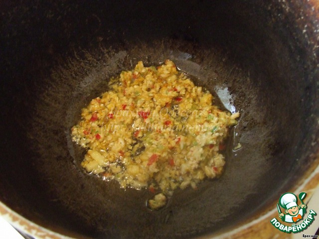 Вок сегодня отдыхал, поэтому в ход пошел старый боевой казанок. Вид у него слегка подуставший, но это не понижает его ценности).