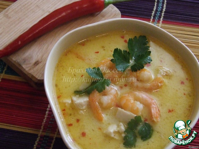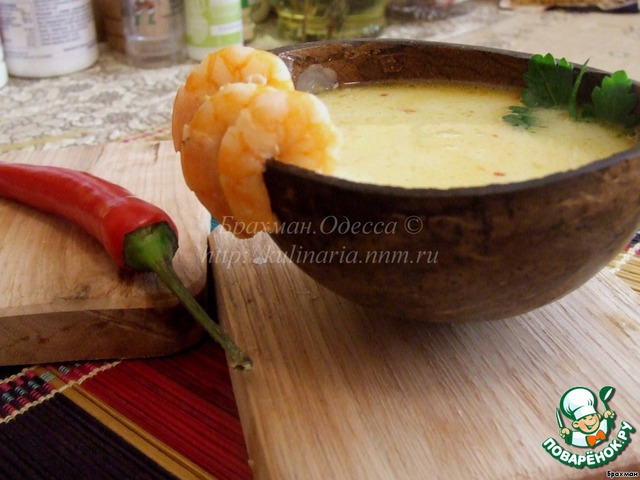 В бульон вливаем кокосовое молоко и доводим до кипения.