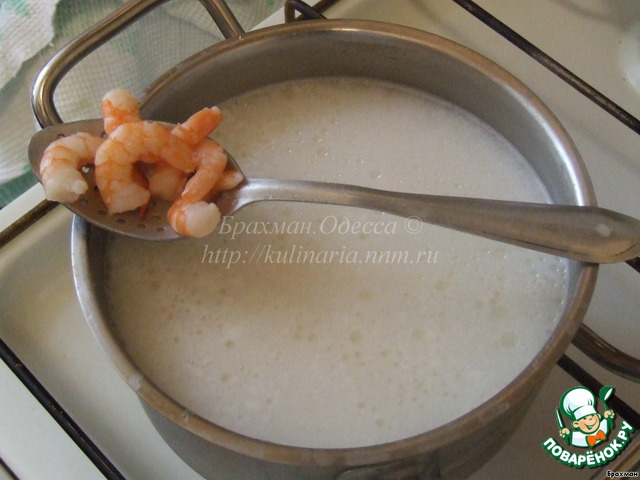 Варим в этой жидкости креветки пару минут. Если креветки были в чешуе, почистить, если нет, оставить в бульоне.