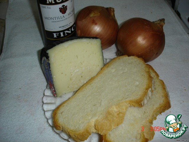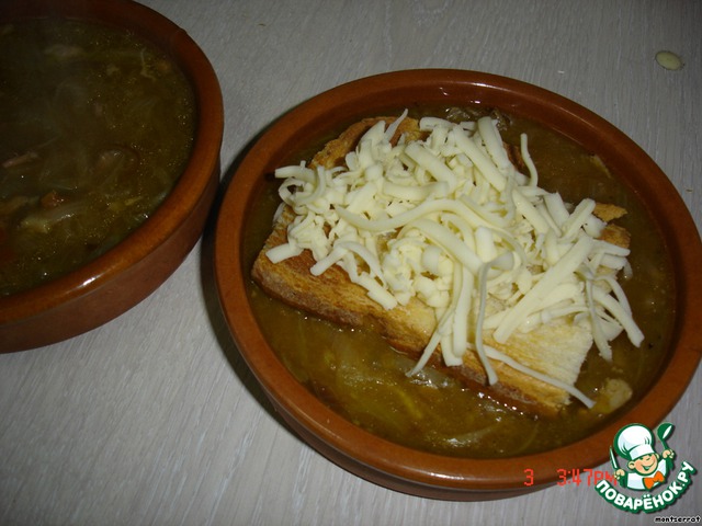 Готовый суп разливаем в порционные керамические мисочки, накрываем ломтем хлеба, обильно посыпаем тертым сыром и ставим в духовку на 10 мин, чтобы сыр зарумянился.