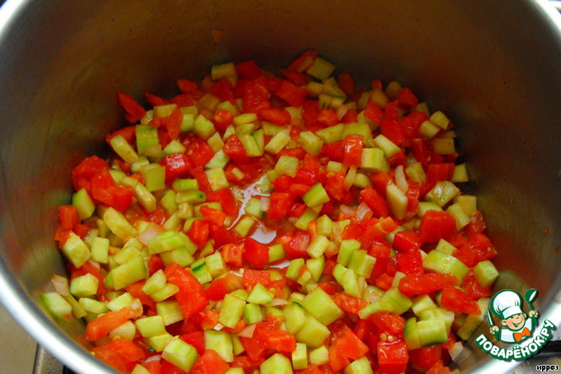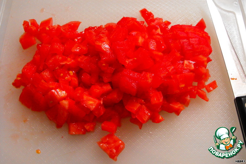 Помидоры(предварительно очистив от кожуры) нарезать.