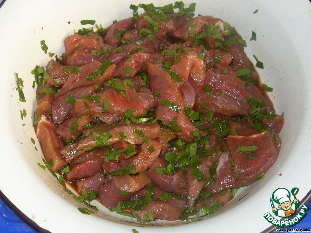 Мясо нарезать тонкими пластинками и замариновать на 1 час в смеси соевого соуса, измельченной петрушки, сахара и чили.