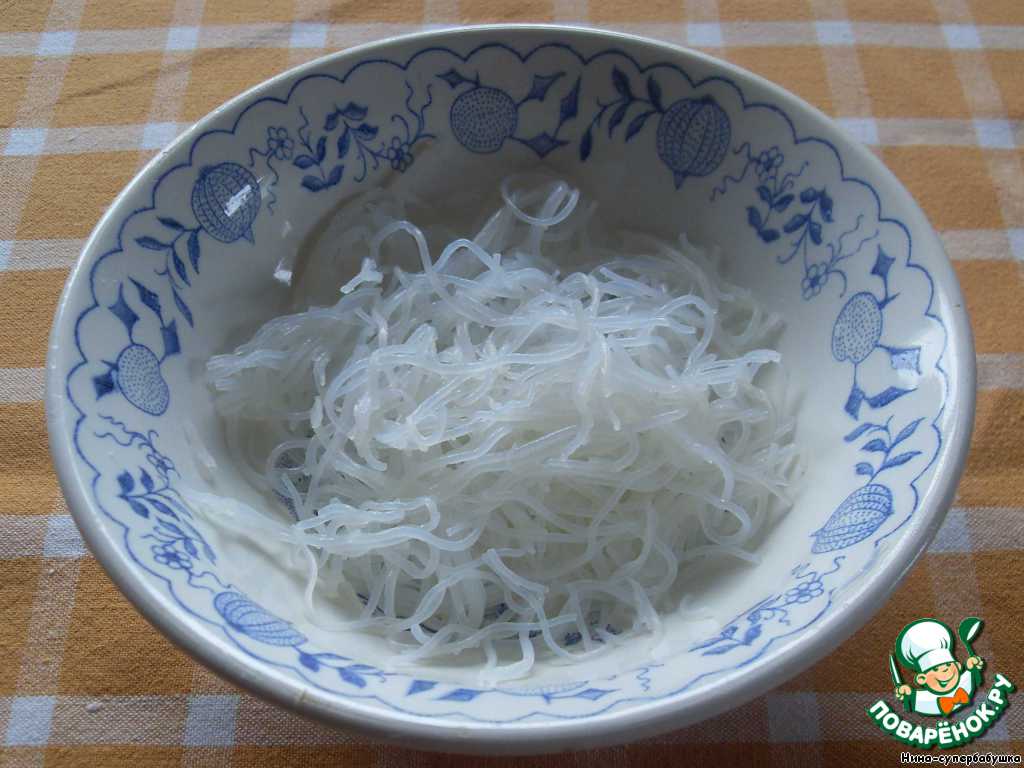 Рисовую вермишель сварить не более 5 минут в подсоленной воде, откинуть и промыть водой.