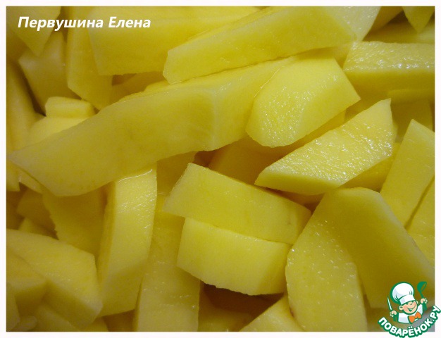 Чистим картофель и нарезаем его брусочками или соломкой.