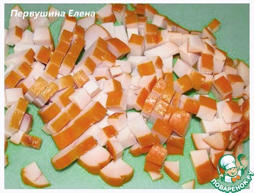 Копченую грудку вместе с кожицей (естественно, она должна быть гладкой и чистой, иначе снимаем ее) нарезаем кубиками.