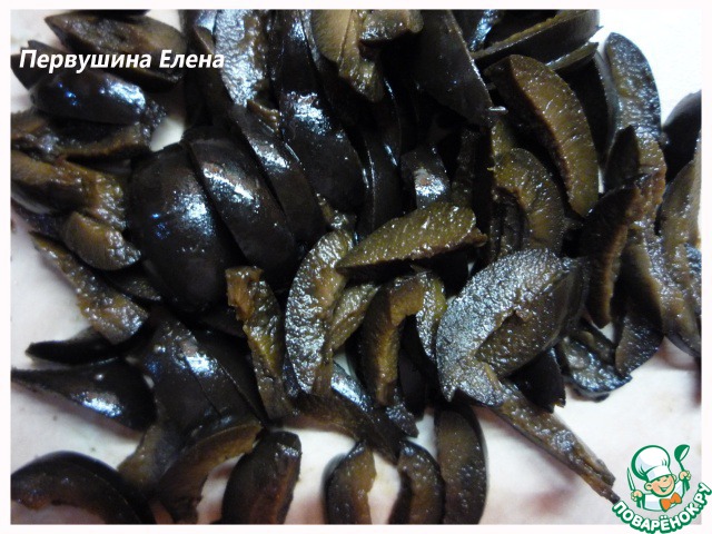 Маслины нарезать соломкой.