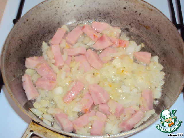 Далее надо разделить ветчину на две части, одну часть нарезать брусочками и обжарить в половине масла вместе с нарезанным луком. В конце жарки выдавить зубчик чеснока и перемешать, закрыть крышкой, снять с огня и отставить в сторону.