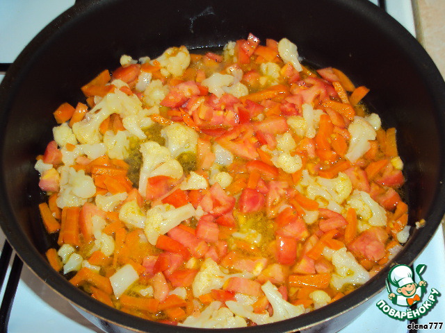 Как капустка и морковь станут мягковатыми, добавить мелконарезанные помидоры, ещё немного потушить.