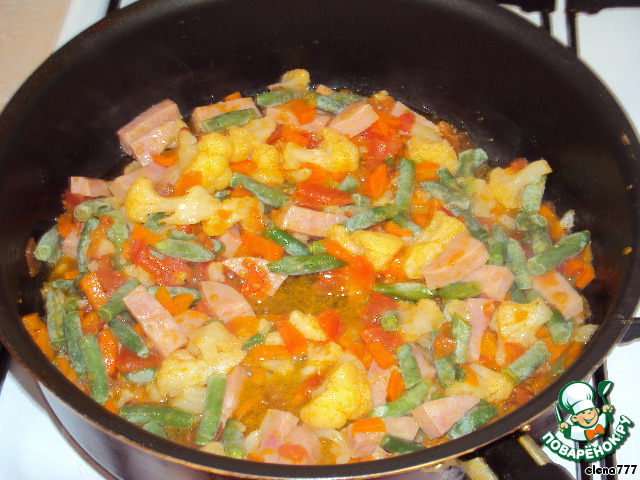 Затем в эту массу выложить вторую часть ветчины, нарезанной брусочками, и стручкоаую фасоль (у меня была замороженная, так же как и цветная капуста) и потушить ещё минут 5.