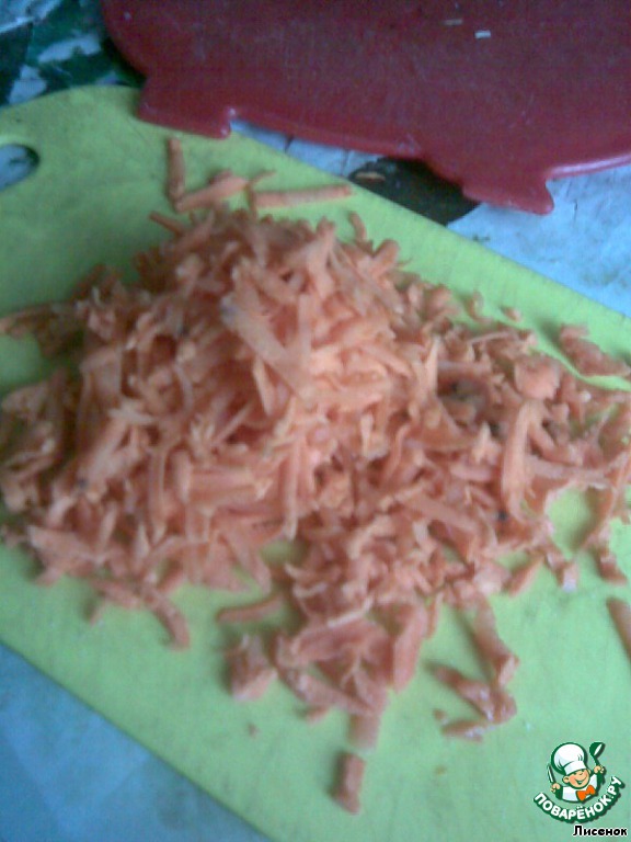 Морковь чистим, трем на крупной терке и отправляем к луку. Пассеруем все вместе еще минуты 2.