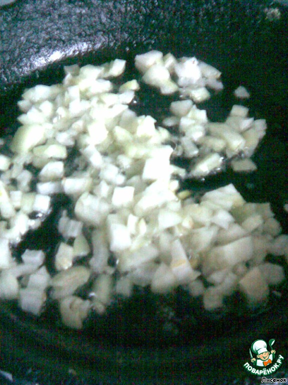 Лук измельчаем и пассеруем в том же масле, где жарилось мясо.