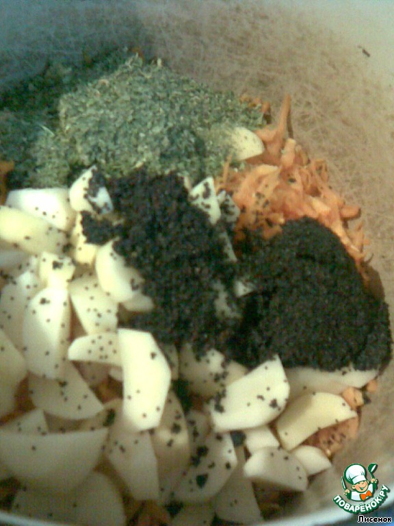 В кастрюлю уложить мясо, обжаренный лук с морковью, тертую тыкву, мак, петрушку сушеную и картофель. Пару лавровых листиков.