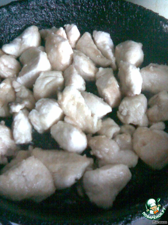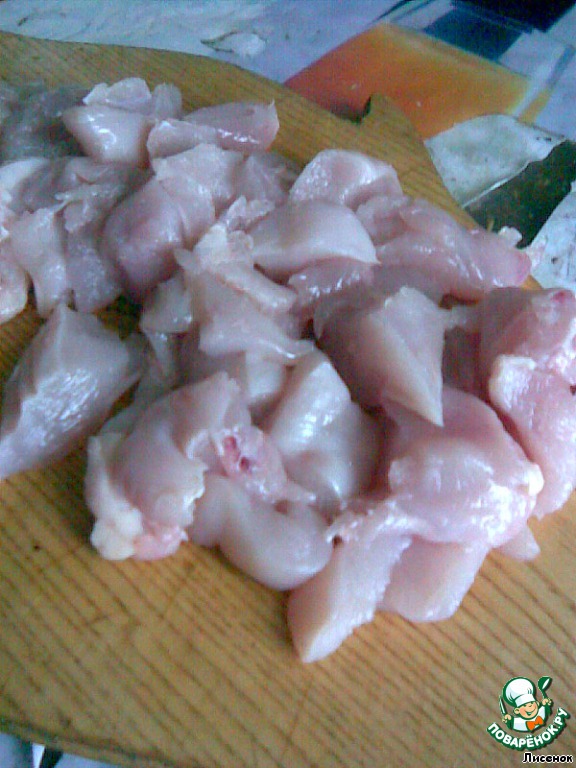 Приступим. Мясо режем на кусочки, примерно 3x3.