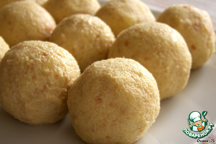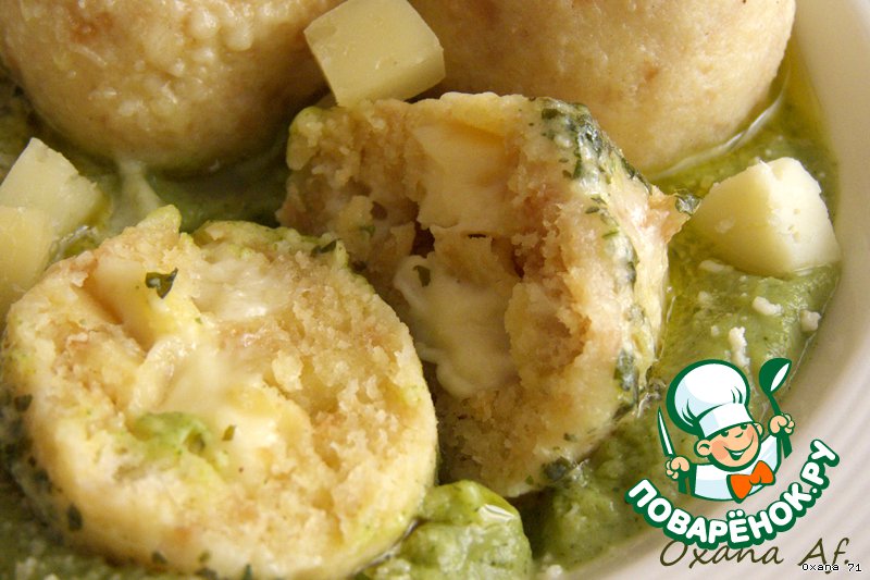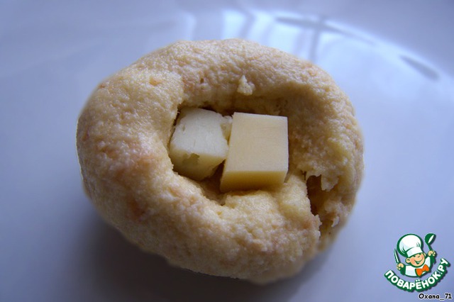 Положить в ямочку 3 кубика сыра (если у Вас сыры разного типа, то, естественно, по одному каждого типа). Закрыть "ямочку" и ещe раз хорошо скатать шар. Важно, чтобы шар получился без трещин, так как во время варки может развалиться!