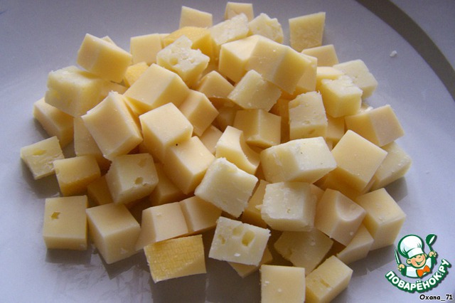 Мягкий сыр (желательно два разных типа: козий или горгонцолла и обыкновенный классический) порезать на кубики, размером примерно 0,7х0,7 см.
