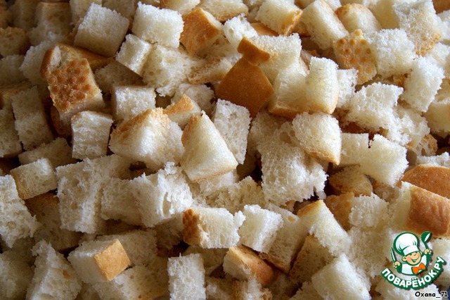 Хлеб, за сутки до приготовления, порезать мелко на "кубики", размером примерно 0,7 х 0,7 см, и оставить сушиться в посуде, прикрытой льняной салфеткой.