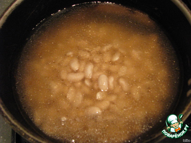 Бульон процедить, оставив 1 половник, добавить промытую фасоль и варить на среднем огне не менее часа, у меня фасоль была готова через 1 час 20 минут.