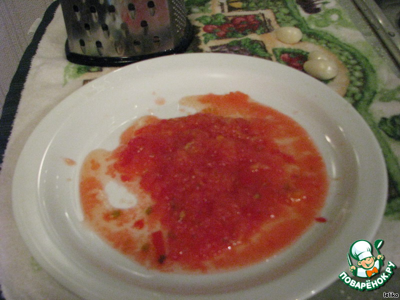 Помидор натираем на терке (нам нужна только мякоть, без шкурки).