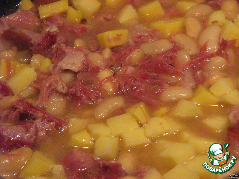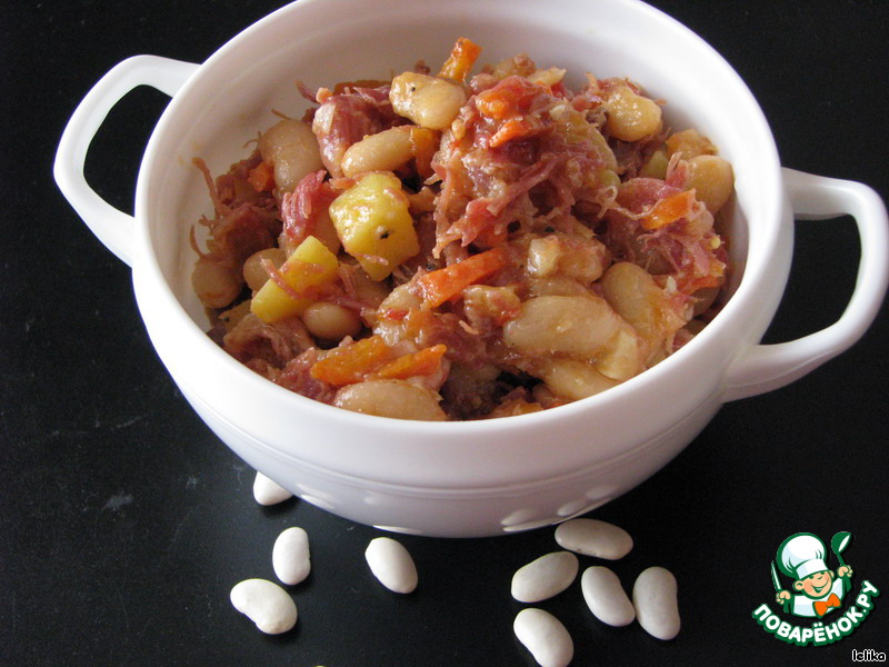 | Очень вкусное сытное блюдо, в котором прекрасно сочетается нежный сливочный вкус фасоли с ароматной овощной подливой, ну и, конечно же, не последнюю роль играет вкус копченого мяса. Рецепт из "Школы гастронома", май 2011. |