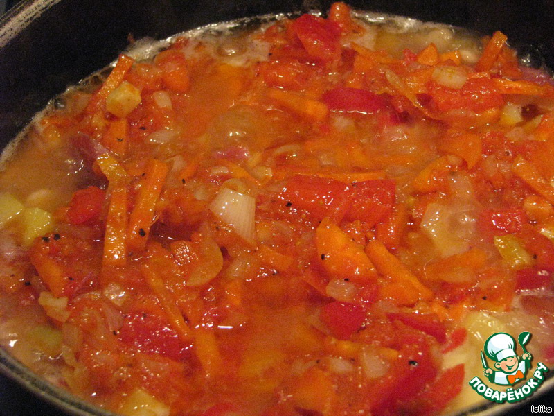 На сковороду налить 1 ст.л. растительного масла, выложить лук и морковь, слегка обжарить, добавить мякоть помидора, нарезанный перец, влить 1 половник бульона и готовить 5 минут.