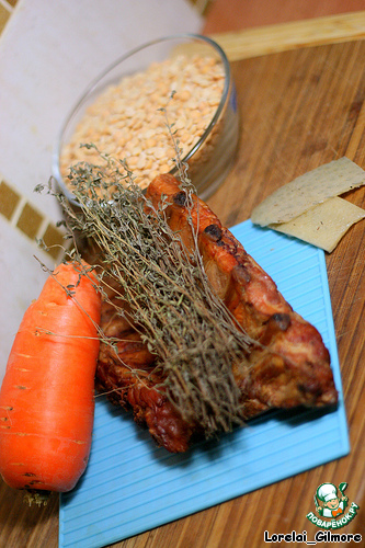 Итак, для бульона нам нужны свиные ребра (копченые), морковь, пучок тимьяна (у меня был сухой).