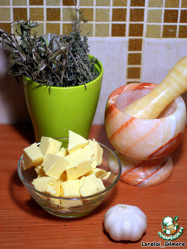 Понадобится головка чеснока, масла сливочного грамм 250-300, крупная соль, немного душистого перца и свежего тимьяна.
