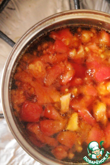 Бульон (можно рыбный или в крайнем случае просто вода) закипятить, добавить перец и соевый соус - в принципе, соль может и не понадобиться, соевый соус даёт "солёность". Добавить помидоры и сново закипятить.
