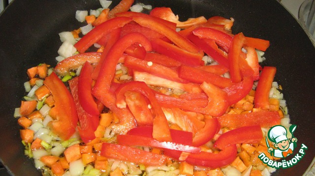 Лук, морковь, чеснок и болгарский перец нарезаем мелко и обжариваем
