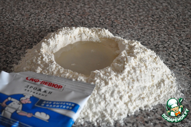Дрожжи смешать с мукой, влить воду, добавить соль и замесить тесто.