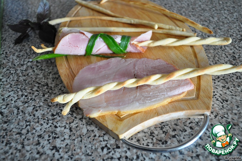 Берем ветчину и накручиваем на палочки, закрепляем луком или петрушкой.