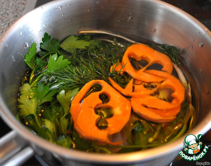 Опускаем их в заранее сваренный куриный бульон и даем покипеть минут 5, процеживаем через сито.