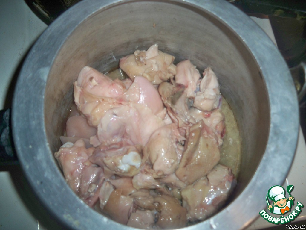 В большой кастрюле с толстым дном (у меня скороварка 5 литров) разогреть масло и обжаривать мясо 5-6 минут.