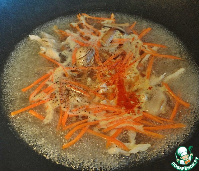 Куриную грудку порезать соломкой, морковь тоже длинной, тонкой соломкой. Грибы порезать пластинками. Всё это сложить в кипящий бульон, добавить уксус, всыпать чёрный и красный перец, уменьшить огонь и варить в течении 6-8 минут.