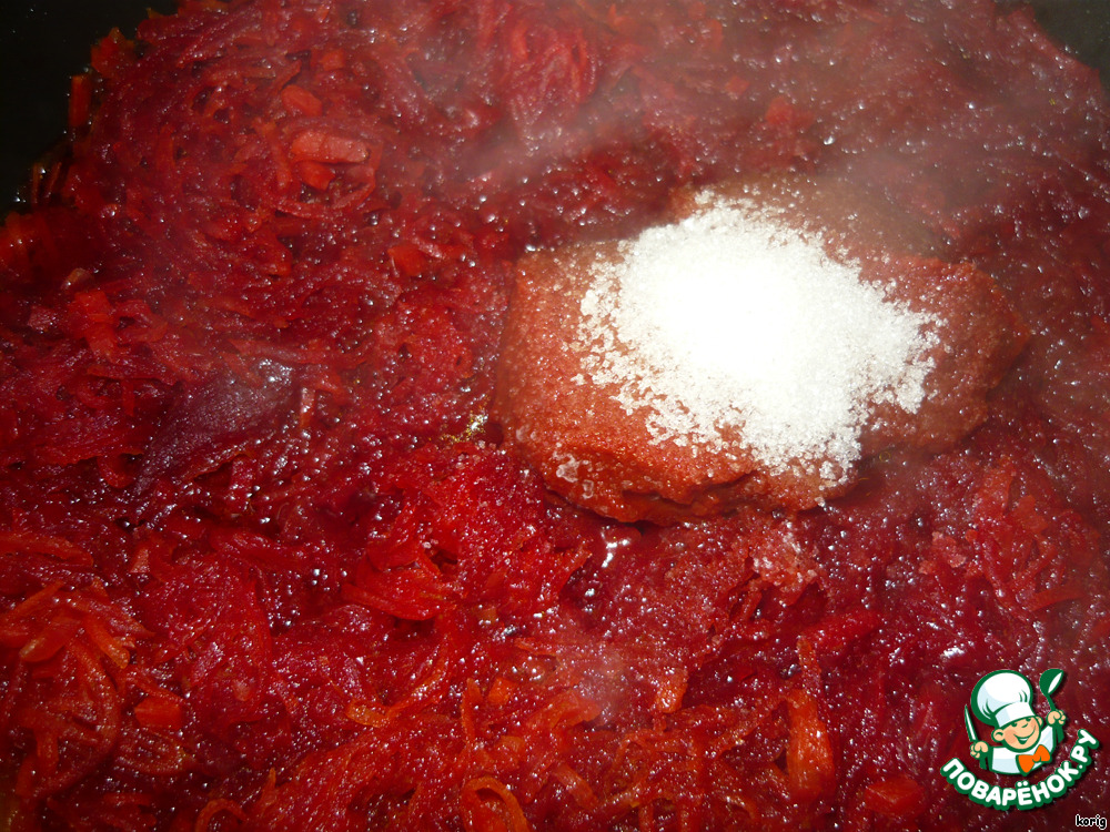 Добавляем томатную пасту, сахар (свекла у меня была не очень), уксус.