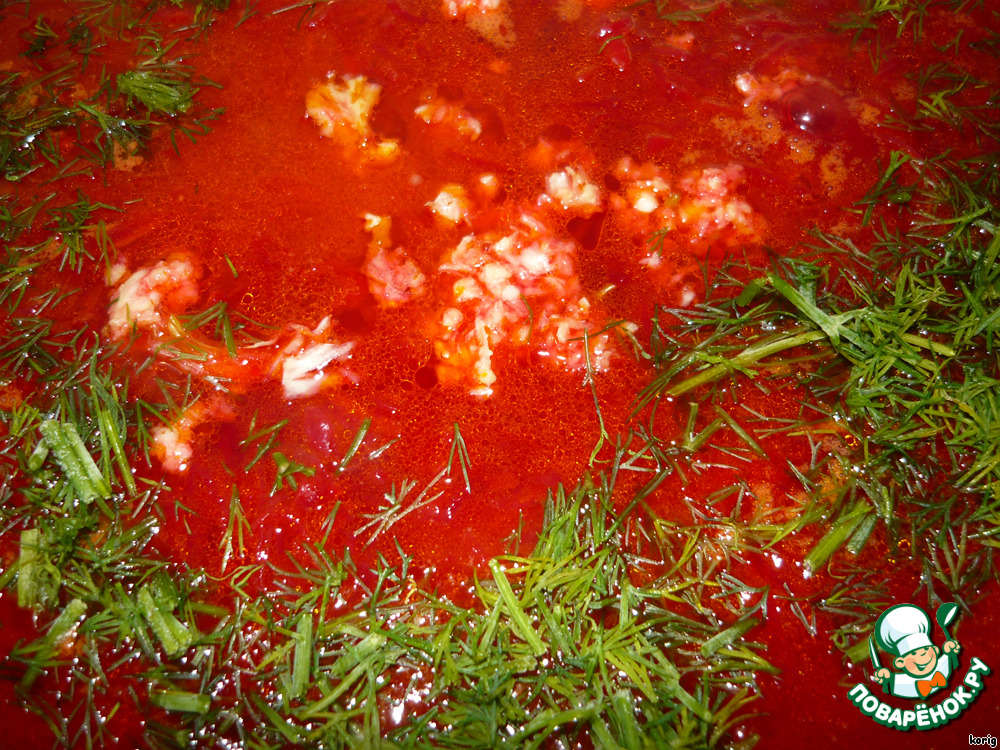 Перекладываем заправку в бульон, ждем пока закипит. Солим. Добавляем чеснок и укроп.