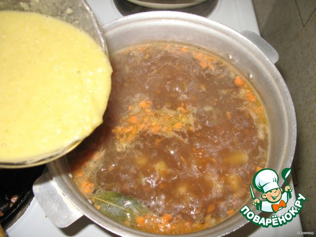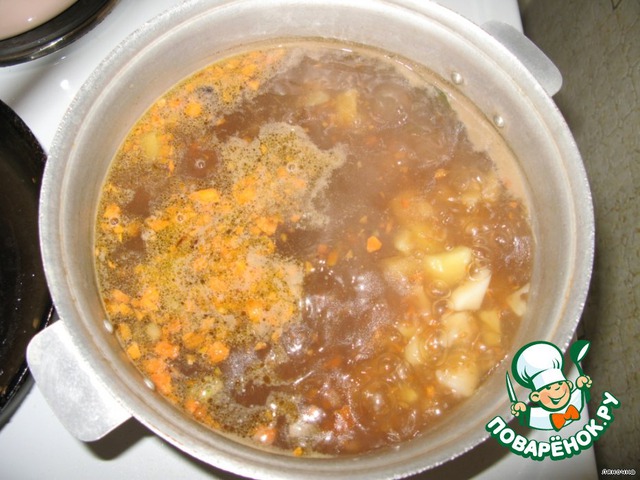 В суп кладем зажарку из лука и моркови. Размешиваем.