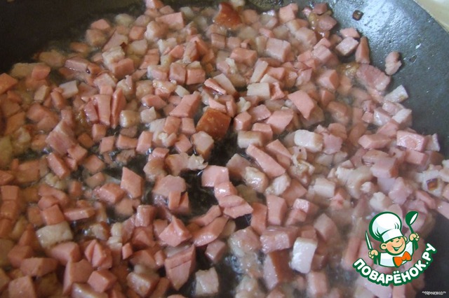 Бекон и грудинку нарезать небольшими кубиками, обжарить и переложить в кастрюлю. Варить примерно еще 10 минут.