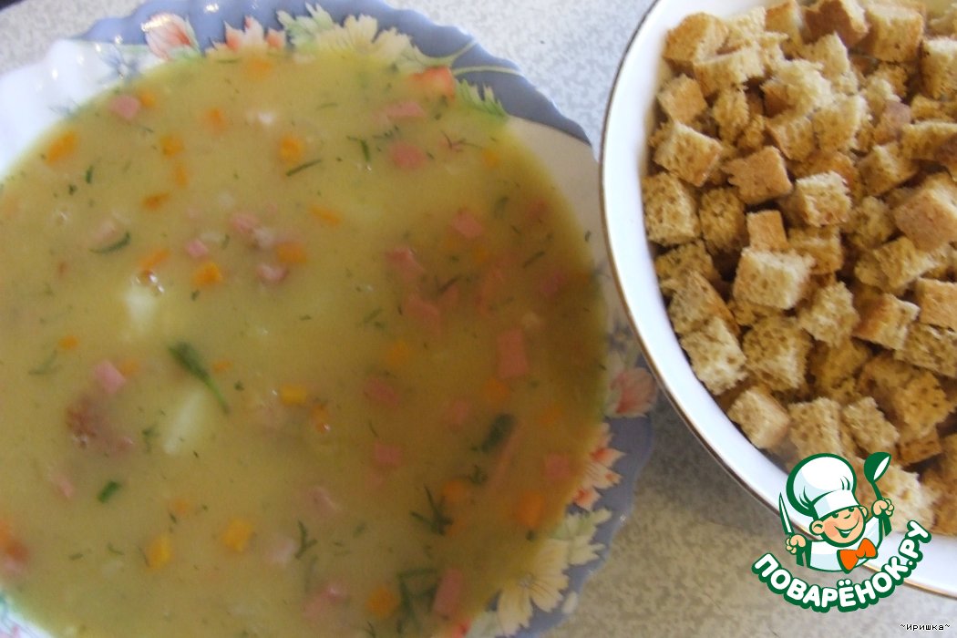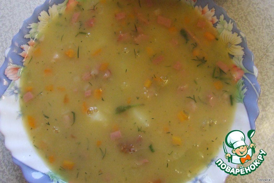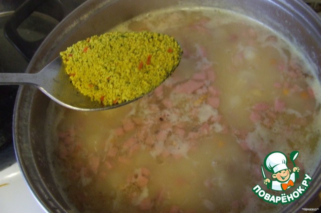 Горох промыть и положить в кастрюлю с бульоном и варить 30 минут.